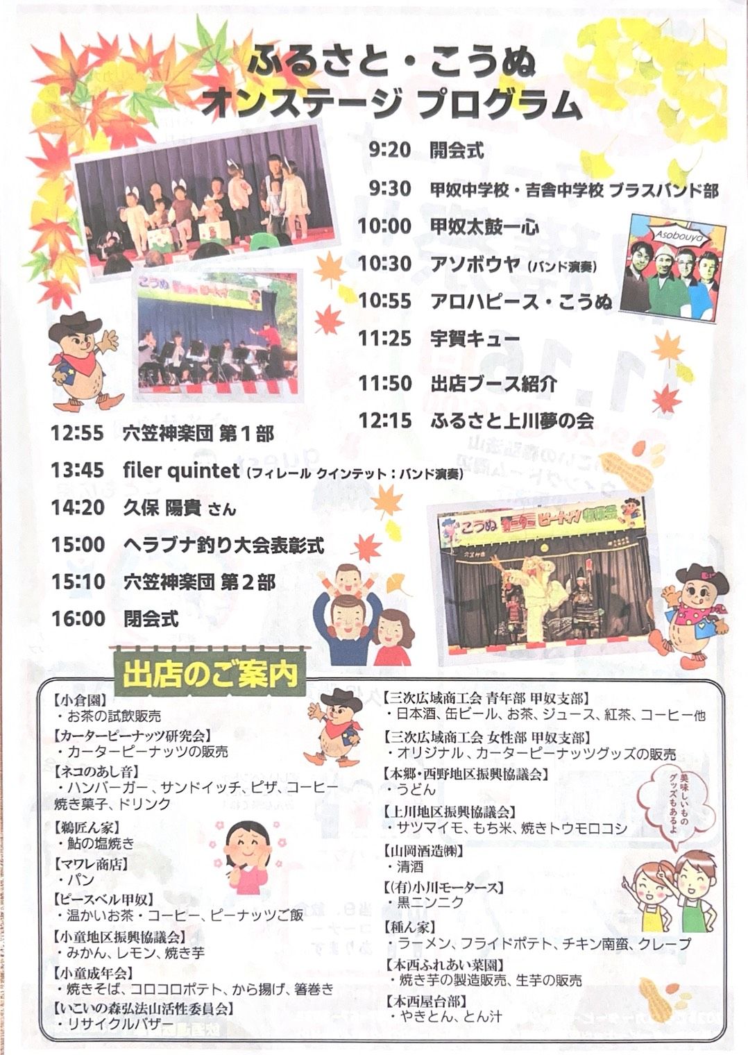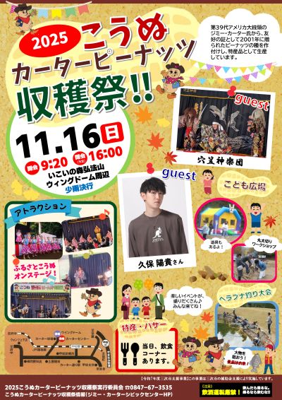 甲奴町の風物・イベント/令和7年7月1日(土)~令和8年1月31日(水)の期間 「御水汲み神事」・「小童の祇園祭」・「書道パフォーマンス・カーター大会 in こうぬ」・「カーターピーナッ ツ収穫祭」・「カーターイルミネーション in 弘法山」・「初日の出を迎える会」・「とんど風景」・「須佐神社の 的弓祭」などのイベントのほか、甲奴町の風物全般(イベント日程については、HP「てくてくこうぬ」参照)