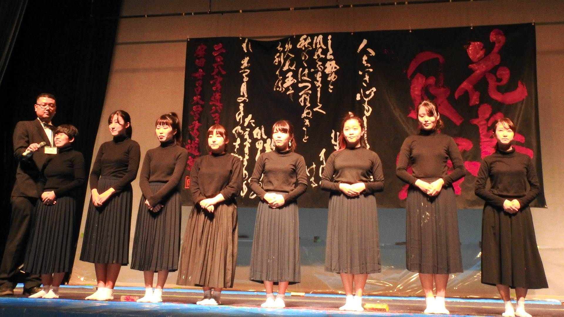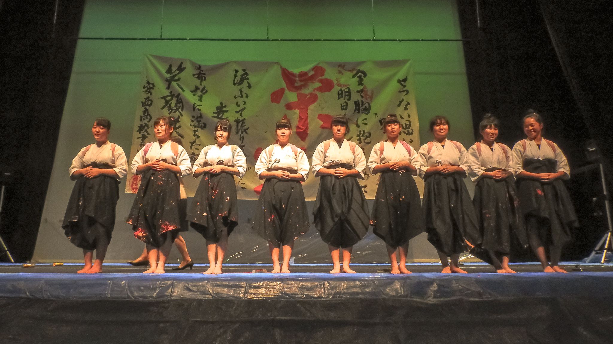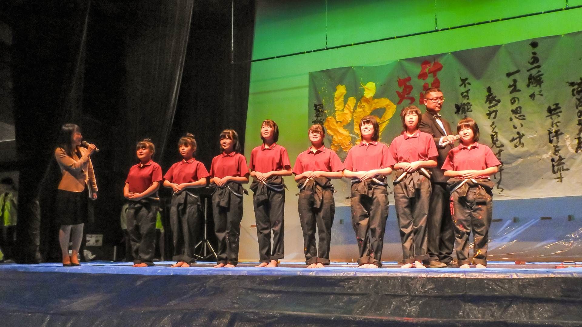 私たち安西高等学校書道部は今回、「栄光」というテーマ、でパフォーマンスをさせて頂きます。今、日本各地を災害が襲い、たくさんの方々が被災されています。少しでも被災されている方々を笑顔にできたらと思い、栄光というテーマにしました。この作品には"振り返らずに走り出せば”いいという言葉があります。今すぐには難しいと思うけど、皆で共に少しずつ走っていければと思います。これまで先輩方や顧問の先生に教わったことを、このパフォーマンスで表現し、そしてたくさんの方々を笑顔にできるよう精一杯披露いたしますので是非ご覧下さい。