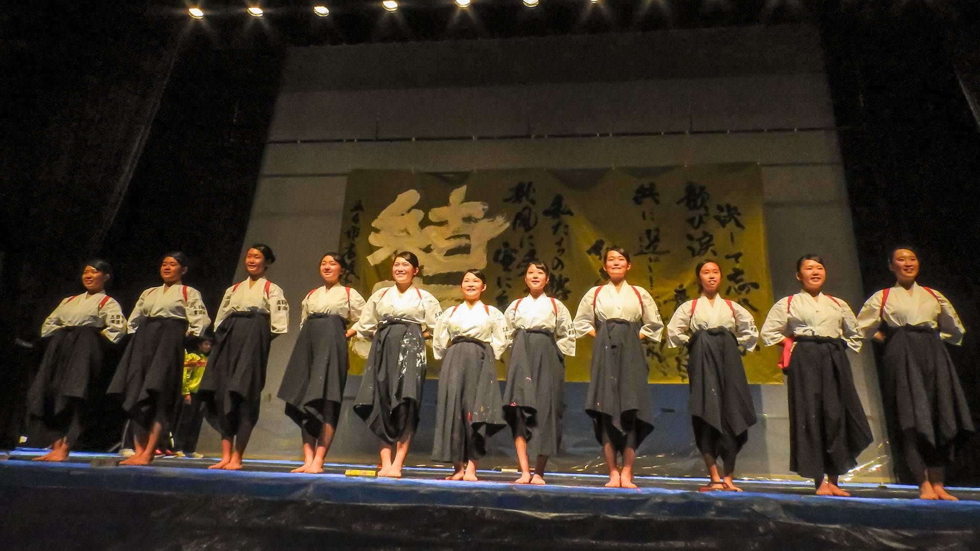 皆さんこんにちは!府中高校書道部です。私達は初めてパフォーマンスの大会に出場します。今回の作品は私達の「青春」をテーマにしてパフォマンスします。一度きりしかない青春を部員の仲間と共に一生懸命駆け抜けている今だからこそ、私達の持ち前の仲の良さと笑顔で全力で表現したいと思い、このテーマにしました。この大会をきっかけに自分達の殻を破り、よりレベルアップしたい、見て下さる人々を感動させるような最高の演技がしたいという強い想いをもって精一杯頑張ります!自分達なりに表現を工夫して日々練習してきたのでそこにも注目して頂きたいです。高校生らしい元気いっぱいのパフォーマンスをお届けします。
