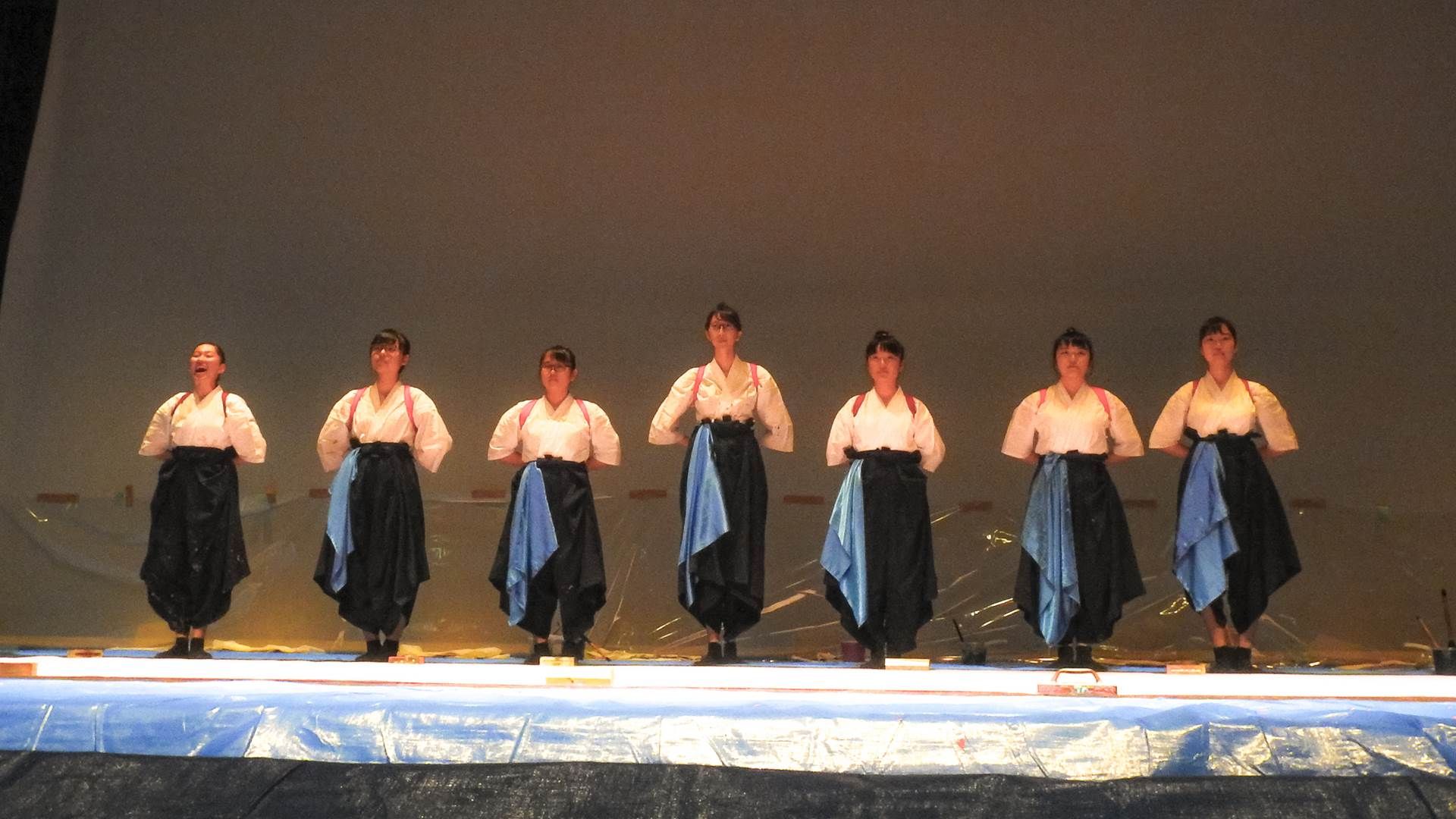 私達尾道北高校書道部はこの大会に参加するのは今年で4回目に なります 今年も自分達の思いをこの大会でパフォーマンスを通して表現したいと思います。今回のパフォーマンスのテーマは「想い」です。 孔子の言葉に次のようなものがあります。 「人生で最も大切なものは「恕」(じょ)である。「恕」(じょ) とは、自分の事と同様に相手のことを考える。つまり、思いやりを表します。思いやりというのは、相手の気持ちを考えた時に初めて生まれるものです。そのような自分と相手との気持ちの交わりをいくつかの色を使って表現してみたいと思います。これまでの練習の成果を発揮し、北高書道部らしい演技ができるように頑張ります。よろしくお願いいたします。