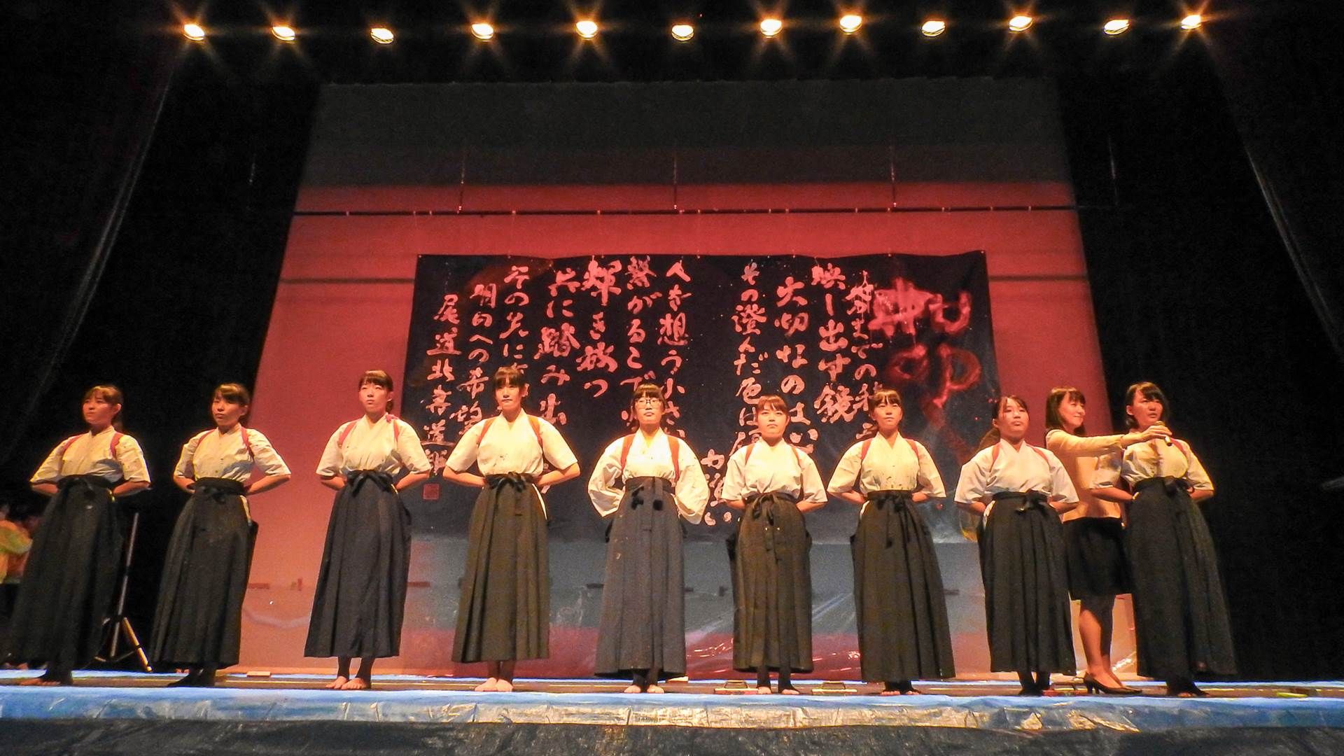 私たちは普段、古典の臨書や書道史や書論の勉強をしていますが、その傍ら、地域でのイベントに参加し、書道パフォーマンスをはじめ書道を通して地域の方々と交流を図っています。カーター大会では、高校生の皆さんの溌剌とした演技に刺激を受けつつも、例えば昨年は、「ラフィーノ」というテーマのもと、上品で洗練されたパフォーマンスになるよう衣装や書き姿などに工夫し、取り組んでまいりました。 今年は会場全体を和の雰囲気で包み込みたいと思っております。日本特有の文字文化である仮名を取り入れるとともに、優雅で奥ゆかしい作品になるよう、精一杯演技いたします。どうぞご覧ください。