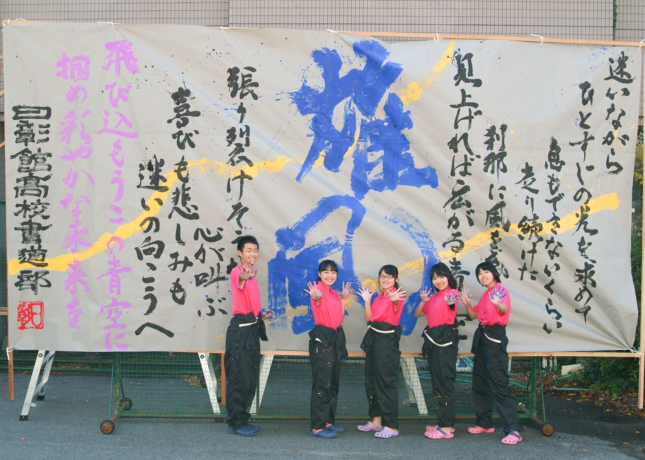 私たち日彰館高校書道部の今年のテーマ は「青春」です。「青春」この2文字の中 にそれぞれの書道への思いを込めました。 書道は楽しいけれど、自分の思うように 書けず、限界を作ってしまう時があります。 そんな時、自分を支えてくれる人たちを思 い出し、あきらめず、前を向いていこうと いう気持ちになれるのです。 日々見守り、 支えてくれている家族や地域の方、厳しく 指導してくださる先生、 皆で支え合える部 の仲間に心から感謝をしながら、 これから も、もっと書道に励みたい、そんな気持ち を大切にする書道部でありたいと思ってい ます。 墨を落とす瞬間から最後に印を押すま で、今の私たち日彰館生らしく、若々しく さわやかに、精一杯のパフォーマンスを披 露します!どうぞよろしくお願いします!