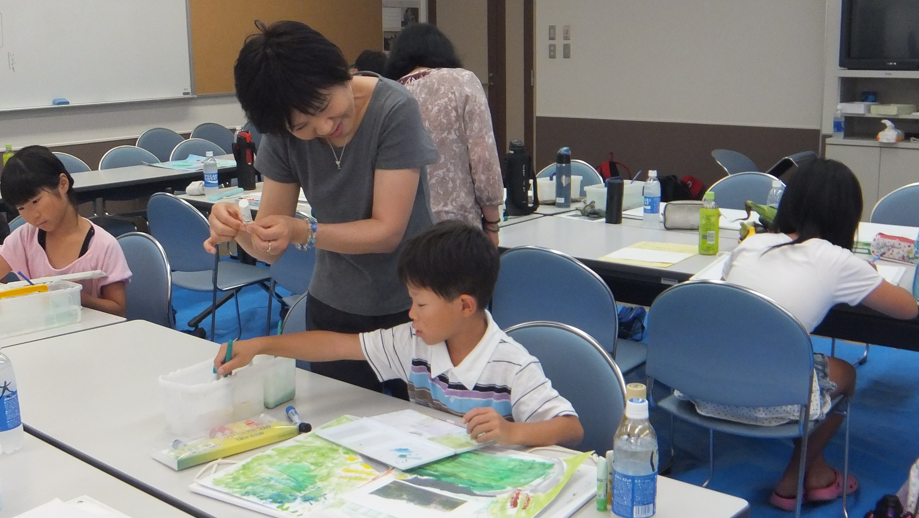 「風景画は、遠くから色塗りするといいよ」「もう少しうすい色に塗るとひきたつよ」「もっと字を大きくかいたらいいね」などアドバイスをもらうと子どもたちの絵も一段と良くなります。