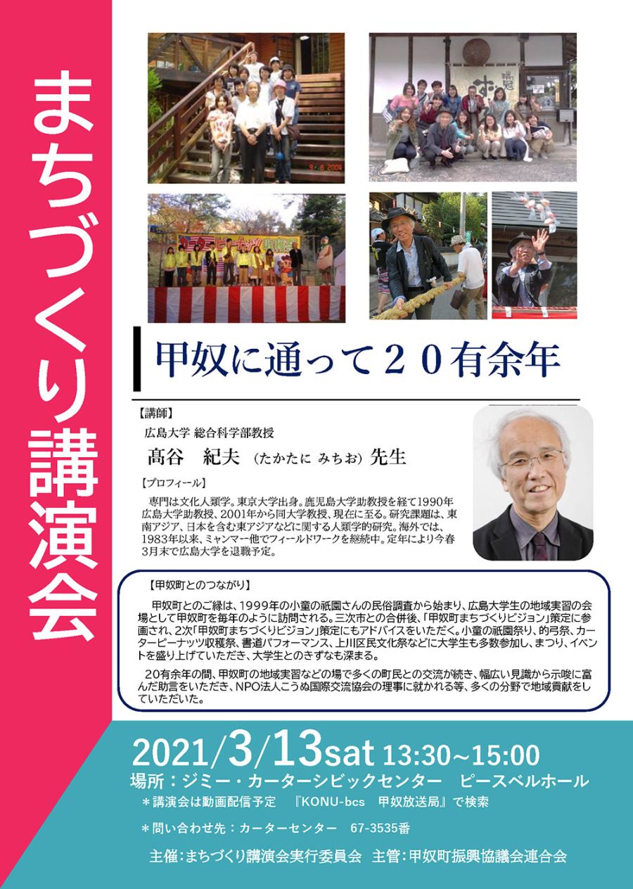 甲奴町とのご縁は、1999年の小童の祇園さんの民俗調査から始まり、広島大学生の地域実習の会場として甲奴町を毎年のように訪問される。三次市との合併後、「甲奴町まちづくりビジョン」策定に参画され、2次「甲奴町まちづくりビジョン」策定にもアドバイスをいただく。小童の祇園祭り、的弓祭、カーターピーナッツ収穫祭、書道パフォーマンス、上川区民文化祭などに大学生も多数参加し、まつり、イベントを盛り上げていただき、大学生とのきずなも深まる。20有余年の間、甲奴町の地域実習などの場で多くの町民との交流が続き、幅広い見識から示唆に富んだ助言をいただき、NPO法人こうぬ国際交流協会の理事に就かれる等、多くの分野で地域貢献をしていただいた。